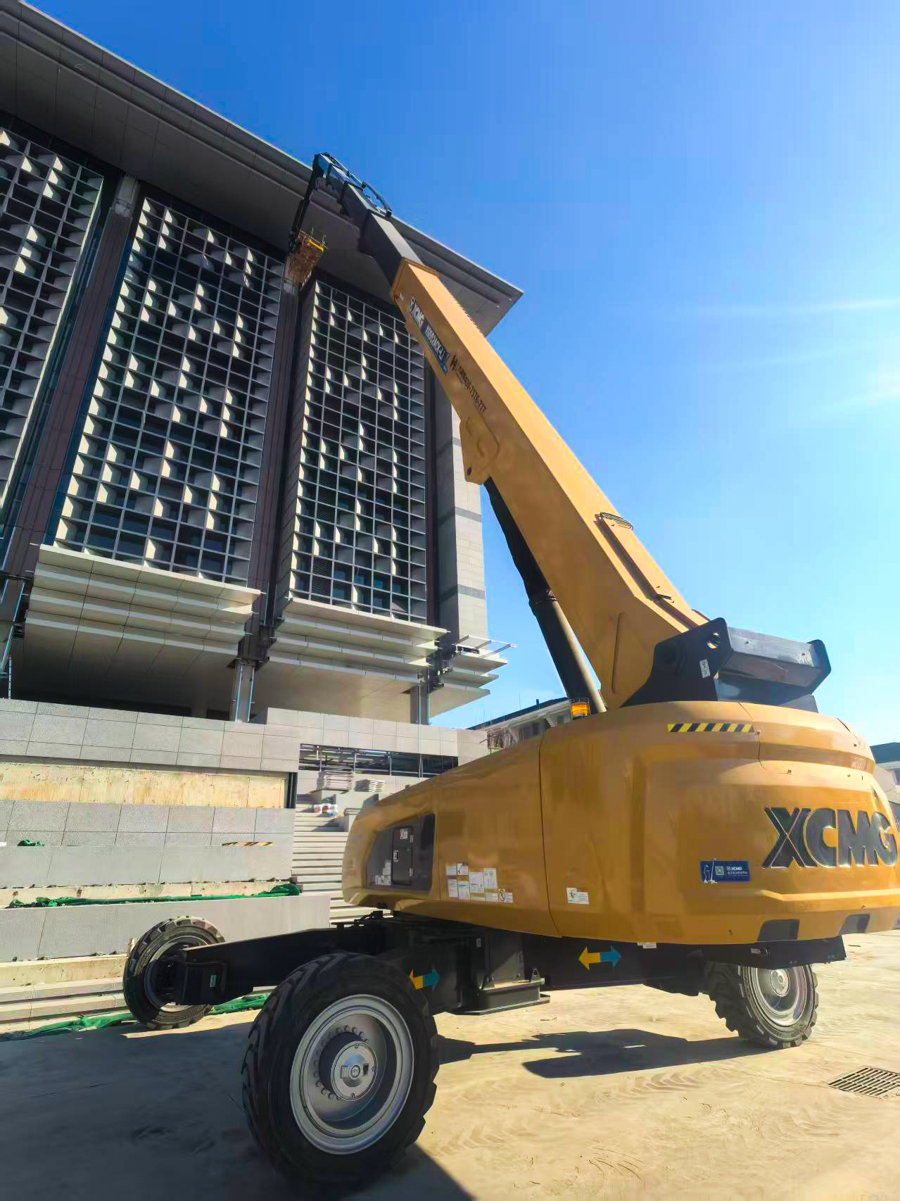 徐工XGS52ACK-Li憑借五節(jié)直臂+二節(jié)曲臂復(fù)合結(jié)構(gòu),施工時作業(yè)平臺距幕墻最近僅0.03米,實現(xiàn)“無腳手架化”精準(zhǔn)就位。