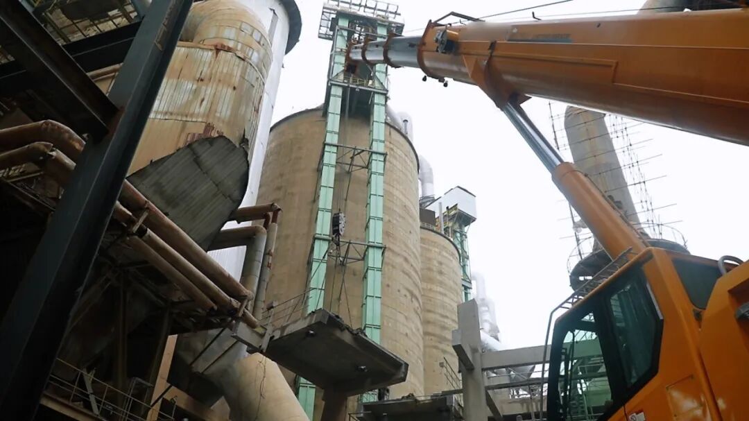 30米高、6米長、5米寬,18到30噸的水泥框架,拆它本就棘手。偏偏場地還受限——后支腿要給旋轉(zhuǎn)配重騰地兒,前臉距離緊湊,頭頂管道壓著,大臂根本伸不開。