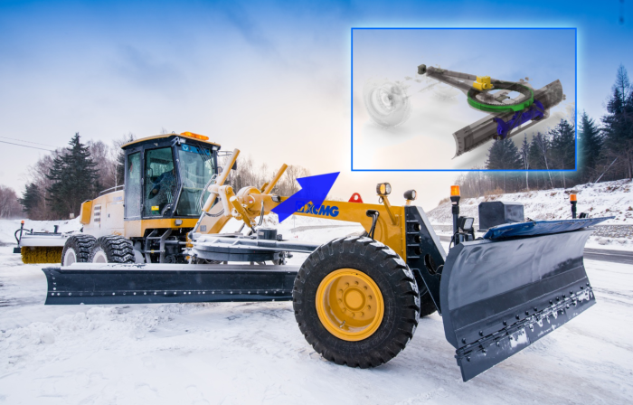 徐工平地機為高效除雪打造了專用除雪輔具:前部推雪板能快速清除積雪和浮雪,中部鏟刀兼?zhèn)涑┡c破冰功能,后部滾雪刷能將積雪掃到路沿,快速除雪保證道路通暢。