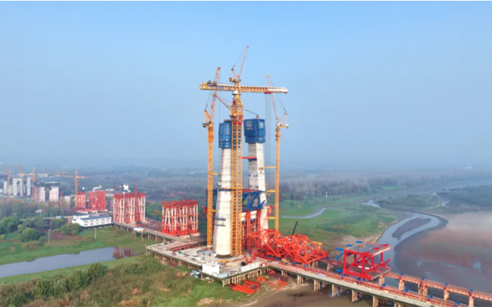 巢馬鐵路馬鞍山長江大橋是世界最大跨度三塔斜拉橋,主塔總高345m。采用XGT15000-600S塔機(jī)進(jìn)行上部鋼塔柱施工吊裝僅需將鋼塔柱劃分為13個(gè)吊裝單元,最大單元重量超550t,較傳統(tǒng)施工方式效率提升65%以上。
