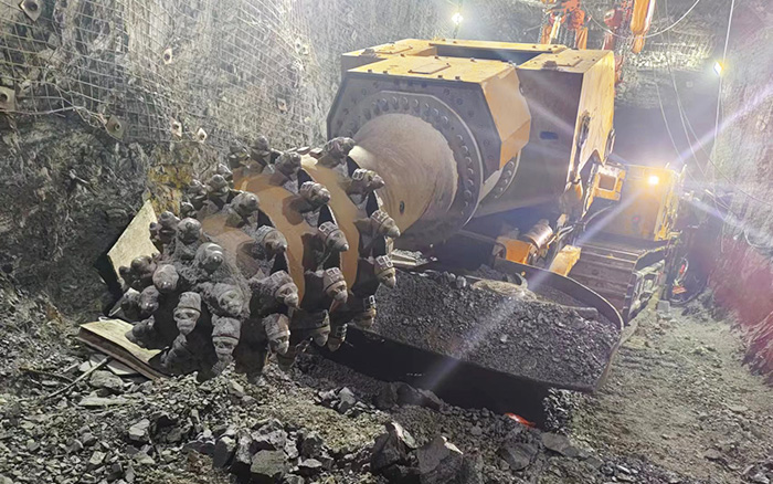 該礦施工斷面5m*4.5m,巖層硬度在60MPa左右,客戶所選購的徐工XTR7/360掘進機最大截割高度7.2m,可實現(xiàn)中等斷面隧道一次開挖成型,切割頭配合硬巖截齒,掘進時可以向巖壁施加每平方厘米1.5噸的力量,在機動靈活的基礎上兼具掘進硬巖的優(yōu)勢。