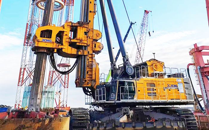 徐工XR1600E旋挖鉆機參建項目為世界上跨度最大的西堠門公鐵兩用跨海大橋,其中5號主塔墩基礎(chǔ)采用18根6.3m鉆孔灌注樁進(jìn)行承載。XR1600E旋挖鉆機需要在大風(fēng)、激流、裸巖、深水的復(fù)雜海洋環(huán)境下為這座超級跨海大橋進(jìn)行夯基,完成目前國內(nèi)最大直徑6.3m的鉆孔施工!