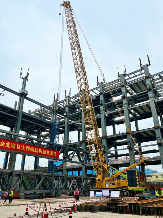 這里是西部(重慶)科學(xué)城鋼結(jié)構(gòu)科學(xué)會(huì)堂工程現(xiàn)場(chǎng),近日,該工程迎來(lái)了重要節(jié)點(diǎn),在數(shù)雙目光的注視下,兩臺(tái)黃色身影仿佛“心有靈犀”,經(jīng)過(guò)緊密配合,西南地區(qū)首例72米大跨度鋼桁架緩緩吊裝就位……