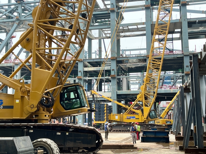 據(jù)該項(xiàng)目的相關(guān)負(fù)責(zé)人介紹,本次吊裝的72米大跨度鋼桁架重約160噸,因其長(zhǎng)度特殊的原因,使用一臺(tái)履帶起重機(jī)無(wú)法完成吊裝作業(yè),項(xiàng)目方在衡量履帶起重機(jī)產(chǎn)品吊重能力、穩(wěn)定性、安全性等多方面后,決定使用兩款徐工XGC350履帶起重機(jī)搭配72米主臂工況,采取“原位拼裝+雙機(jī)抬吊”的吊裝手法完成本次施工。