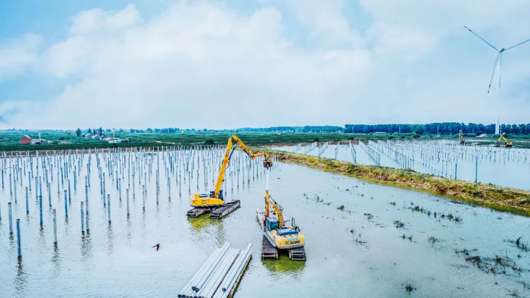在漁業(yè)較為發(fā)達(dá)的濱海港鎮(zhèn),“漁光互補(bǔ)”光伏發(fā)電項(xiàng)目建設(shè)正如火如荼,項(xiàng)目現(xiàn)場(chǎng),徐工水上打樁機(jī)的身影隨處可見(jiàn)。