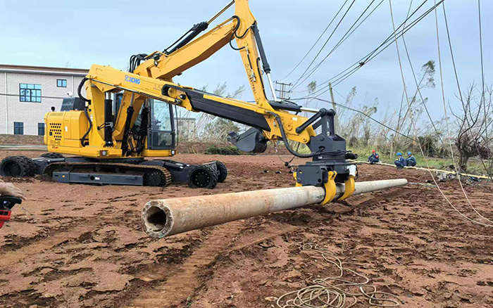 徐工開挖立桿一體機產(chǎn)品一車多能,平均每次新立電桿作業(yè)僅耗時20分鐘,是砼桿組立施工作業(yè)的革新式產(chǎn)品。相較傳統(tǒng)作業(yè)人力、吊機與挖機配合的方式,更具通用性、高效率和安全性,為本次臺風(fēng)搶險救援行動節(jié)省了大量的人力和時間成本,獲得施工方的高度認可。
