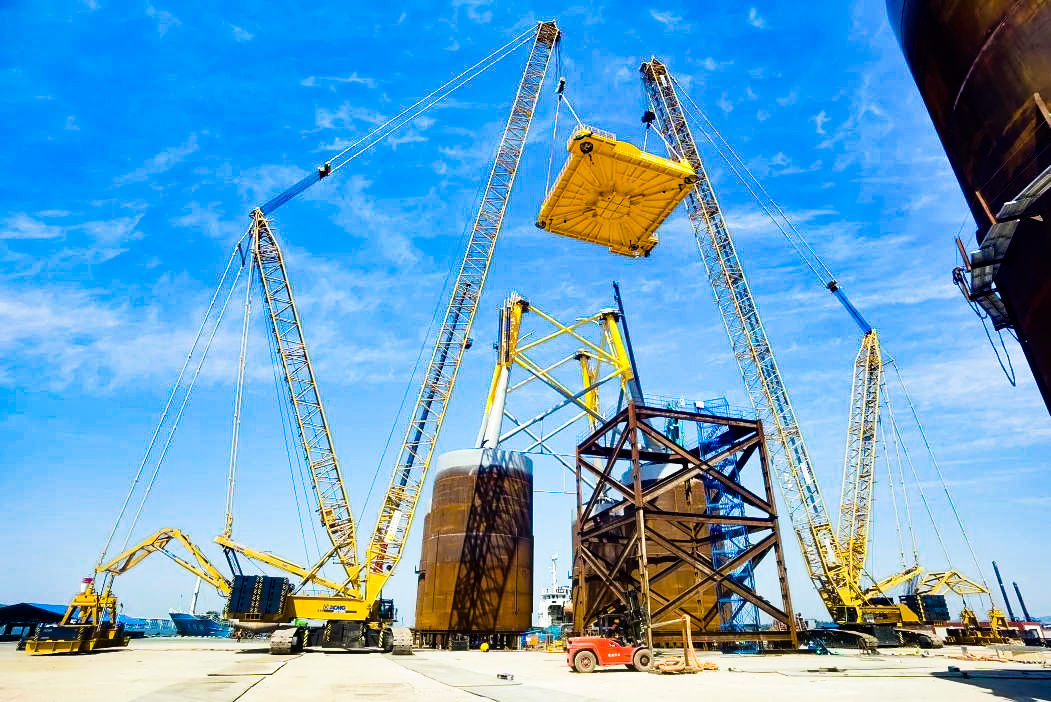 近日,兩臺XGC12000履帶起重機(jī)在我國南部地區(qū)某大型海上風(fēng)電項(xiàng)目總裝基地順利完成首個吸力筒導(dǎo)管架總組吊裝工作。