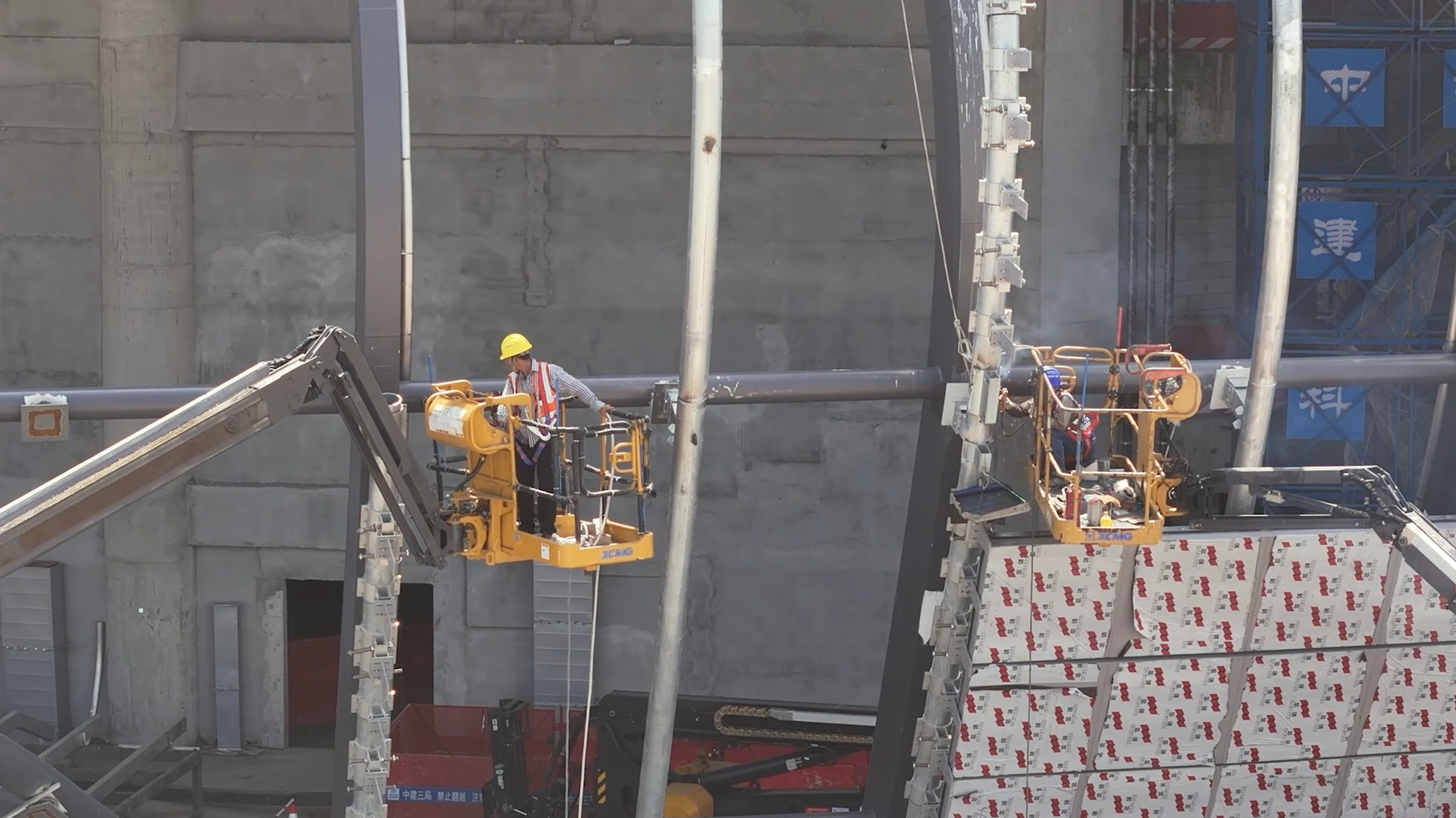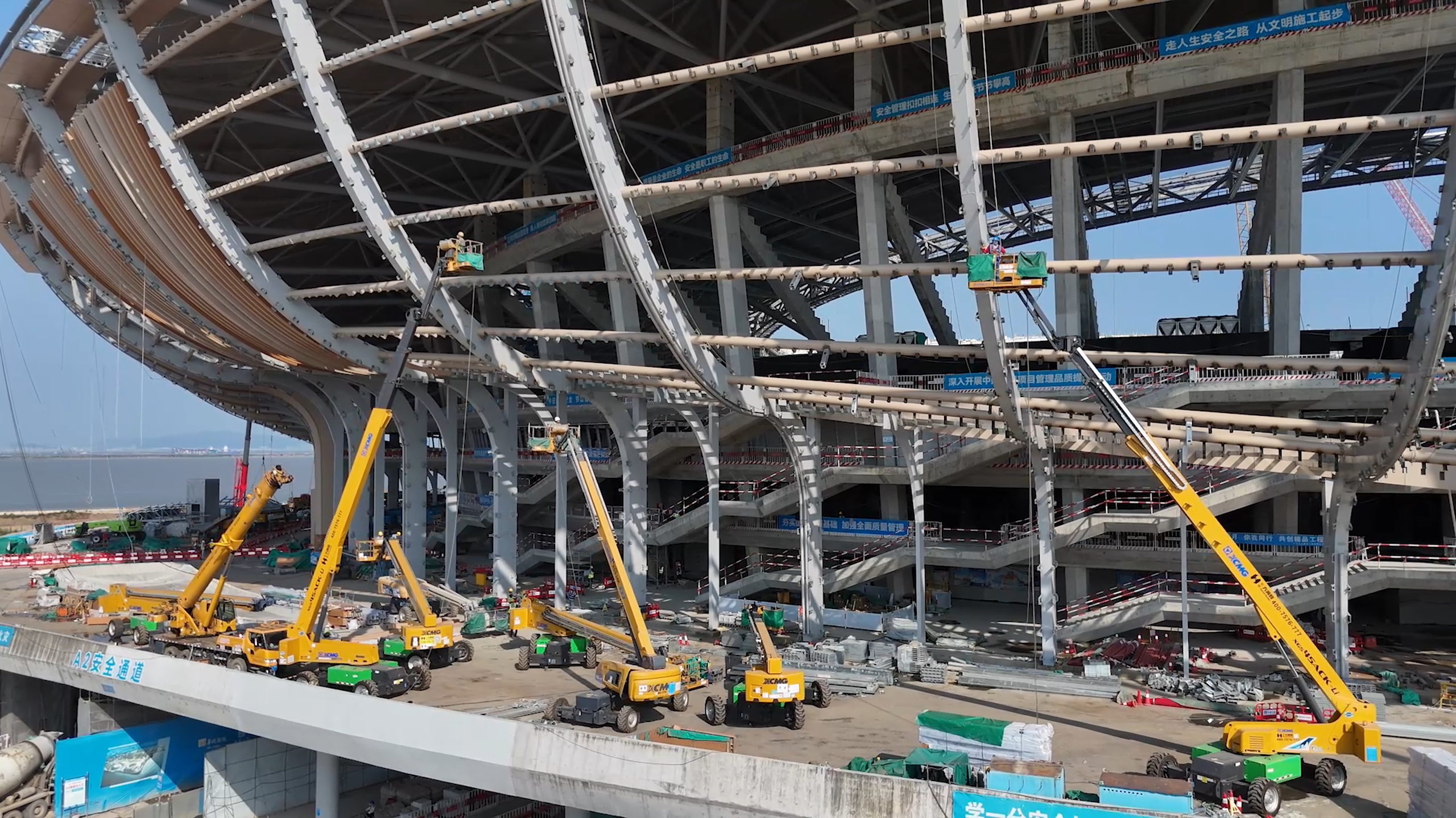 近日,徐工多臺大米級高空作業(yè)平臺亮相廣州南沙體育館項目,進行鋼結(jié)構(gòu)焊接及安裝工作。