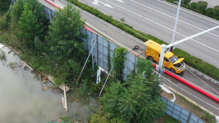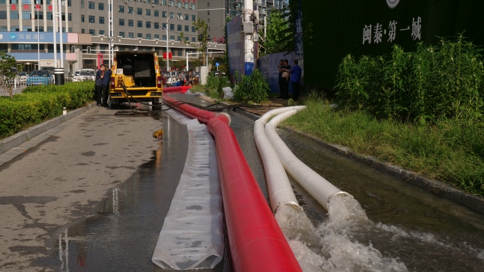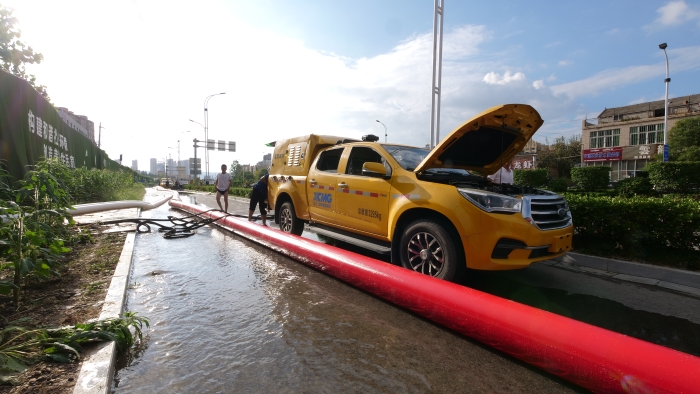 調(diào)試車輛、鋪設(shè)水帶、檢查管路,現(xiàn)場排水作業(yè)緊鑼密鼓地進(jìn)行著。XGH5030TPSQ6爭分奪秒與時(shí)間賽跑,每臺(tái)車流量超600m3/h,最大可達(dá)1000m3/h,將積水源源不斷地排入下水道中。