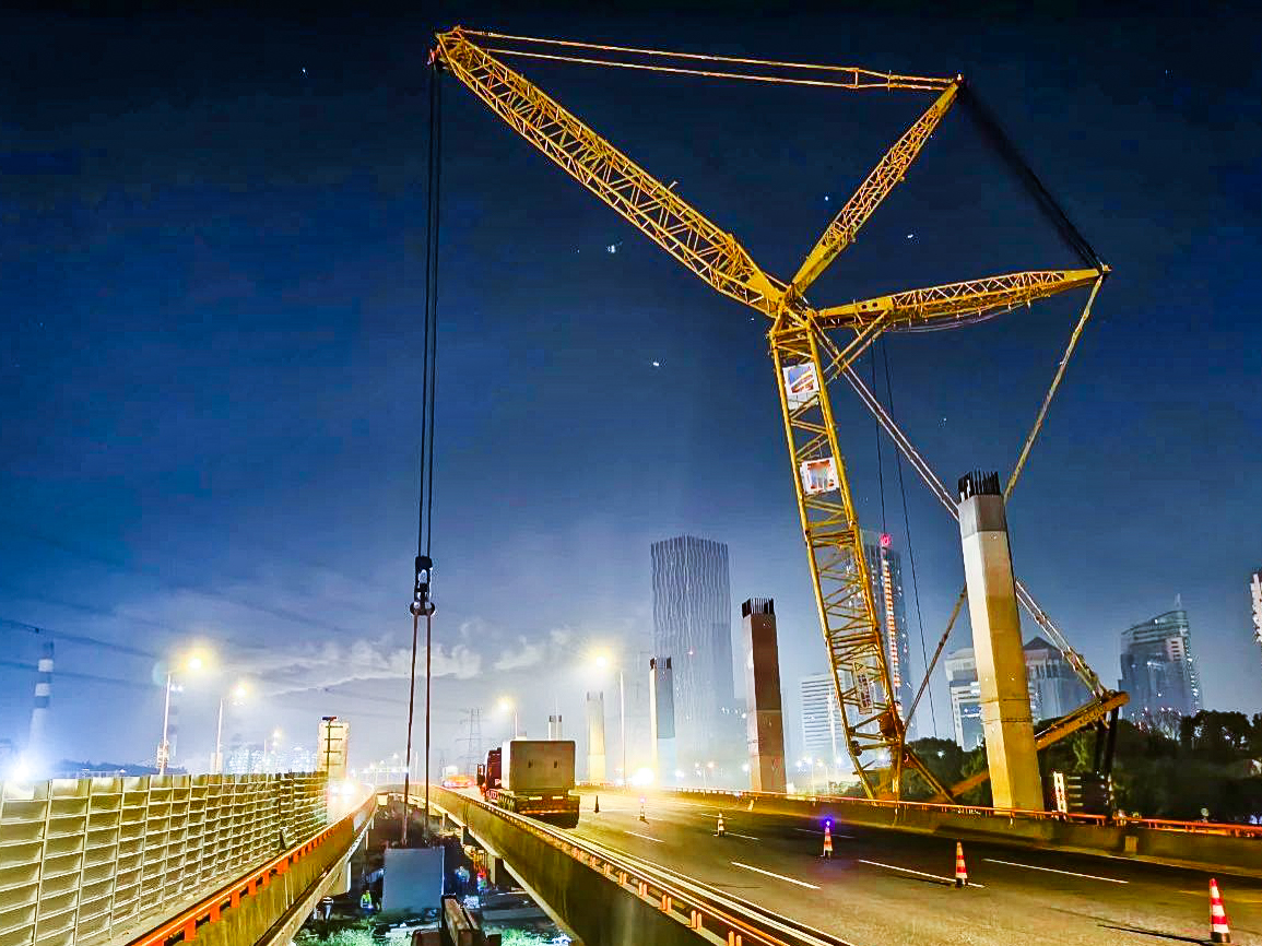 施工現(xiàn)場(chǎng),XGC6500采用30+30m塔式副臂工況,將長(zhǎng)23.7m、寬2.6m、高2.8、重99.2t的鋼蓋梁精準(zhǔn)吊裝到位。吊裝當(dāng)日,XGC650位于高速南側(cè),橫跨高速內(nèi)圈四根車道,進(jìn)行立柱蓋梁吊裝。盡管施工場(chǎng)地受限,XGC650仍穩(wěn)定發(fā)揮,將整個(gè)吊裝過程控制在驚人的4小時(shí)內(nèi),全程零失誤,贏得了項(xiàng)目組施工人員的高度贊譽(yù)。