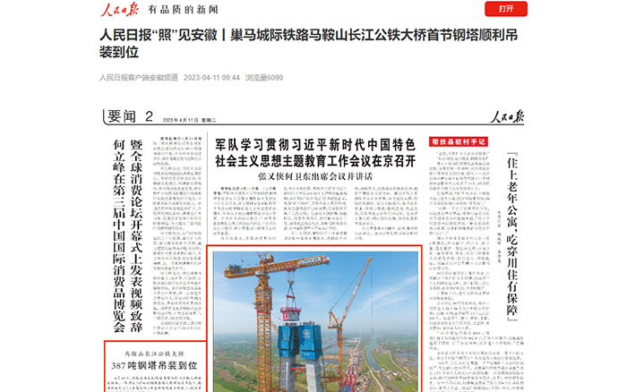 首節(jié)鋼塔吊裝過程獲得《新聞聯(lián)播》《東方時空》《人民日報》《央視新聞》、CCTV4、中國新聞網(wǎng)、新華報業(yè)網(wǎng)、《新民晚報》、安徽網(wǎng)、荊楚網(wǎng)、齊魯網(wǎng)、高鐵網(wǎng)、《馬鞍山日報》等多家央省級主流媒體集中跟進(jìn)報道,引起廣泛關(guān)注。