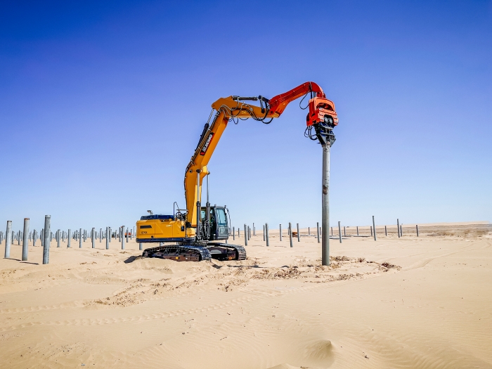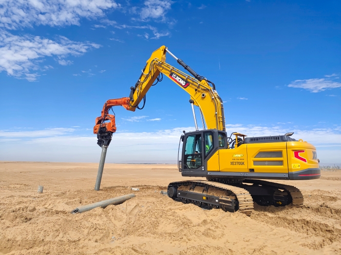 與以往常規(guī)項目不同,此次徐工挖掘機主要擔(dān)任光伏樁的鋪設(shè)工作,通過改裝振動錘和引孔機等多功能屬具,有效滿足現(xiàn)場多元化施工需求。