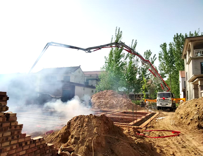 河南新農(nóng)居工地上,徐工33米泵車搭載徐汽底盤,征服泥濘坡道,靈活游走窄巷、鄉(xiāng)道,到達建筑房屋,長臂延展,將混凝土精準(zhǔn)送達房屋地基。