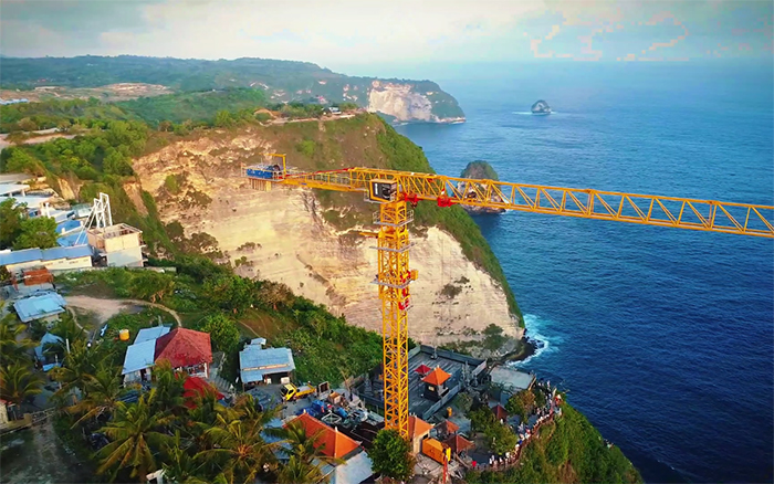 碧藍(lán)海灣、潔白沙灘,在旅游勝地印尼巴厘島,徐工XGT360-20S1屹立在懸崖峭壁之上,眺望懸崖海景和奇特的海岸線景觀,為巴厘島佩尼達(dá)精靈海灘觀光電梯項目注入徐工“動力”。
