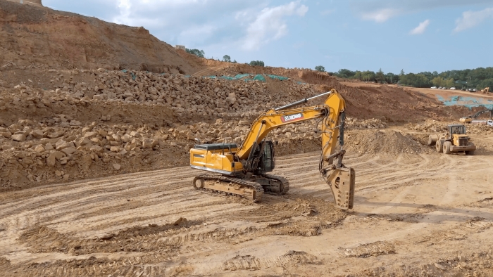 站前區(qū)堆積的大體積巖體,正被徐工XE380GK的破碎錘系統(tǒng)轉(zhuǎn)化為可再生建材。