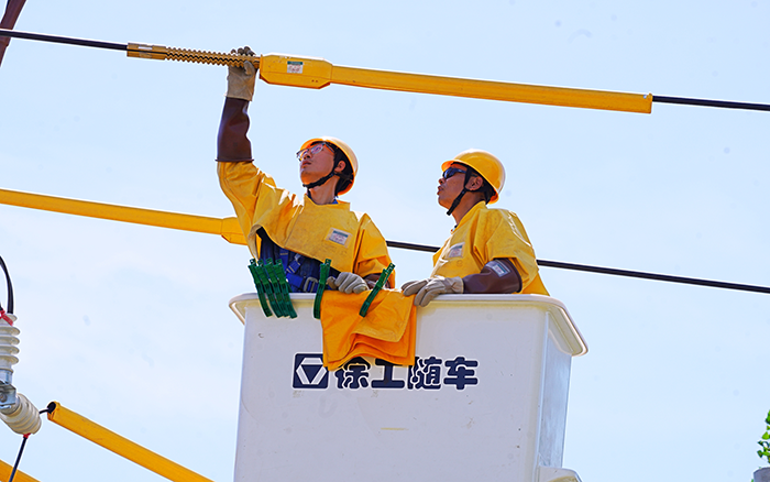 當日,驕陽似火,酷熱難耐,地面溫度高達 40℃。但供電工作人員們毫不退縮,他們爭分奪秒,絕緣手套里的手掌早已被汗水泡得發(fā)白,卻仍穩(wěn)穩(wěn)攥著工具精準操作;斗臂車內的溫度計指針不斷攀升,他們卻顧不上擦去汗珠,全神貫注盯著線路接口。為了縮短停電風險窗口,用高效的操作與高溫賽跑,全力保障供電不中斷。徐工 GKJH22A 絕緣斗臂車穩(wěn)穩(wěn)地??吭谧鳂I(yè)點旁,它猶如一位鋼鐵巨人,隨時準備為施工人員提供堅實的保障。