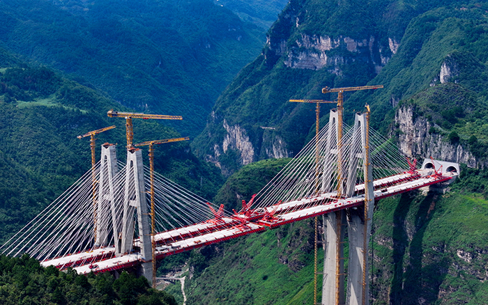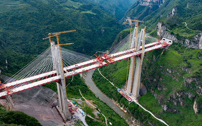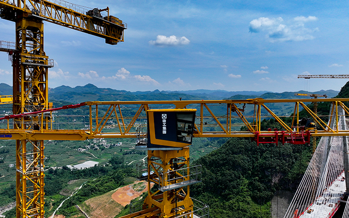 在黔中腹地懸崖峭壁間的烏長高速公路金旗特大橋項目上,徐工群塔與施工升降機協(xié)同作業(yè),助力世界最高深山峽谷連體斜拉橋建設。
