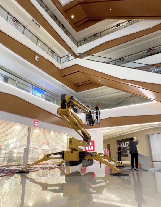 在杭州某大型商場(chǎng),徐工XGS26X-Li將四只“蜘蛛腿”穩(wěn)穩(wěn)“扎根”在商場(chǎng)中庭,正在向玻璃圍欄下方的墻壁伸展臂架。超窄車(chē)身“溜”進(jìn)商場(chǎng)、伸縮臂架“瞄”準(zhǔn)墻面,這是徐工蜘蛛車(chē)在商場(chǎng)進(jìn)行維修保養(yǎng)的日常。而看似日常的施工,需要面對(duì)三關(guān)“難題”。