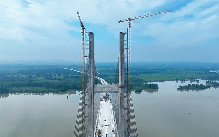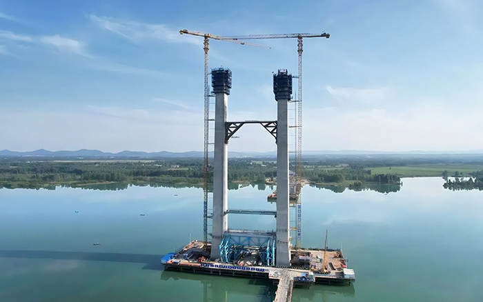 大橋主塔采用“H”型造型結(jié)構(gòu),總高度201米,XGT360-20S1、XGT7528A-18S1屹立在大橋兩側(cè)肩負(fù)主要吊裝工作,滿勤作業(yè)、高效運(yùn)轉(zhuǎn),保障高空對接安全,雙塔協(xié)力頻頻突破重要建設(shè)節(jié)點(diǎn)。