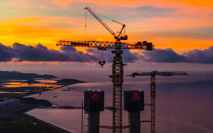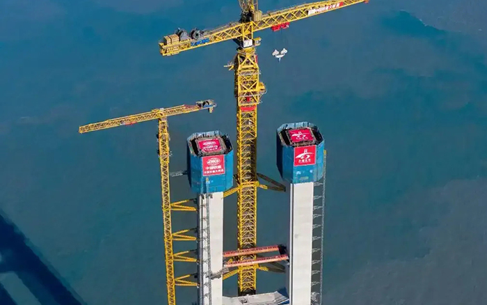 在封頂作業(yè)中,徐工塔機將百噸構(gòu)件以毫米級精度吊裝至200余米高空,硬剛10級海風,創(chuàng)造了海上橋梁建設(shè)新紀錄。多臺群塔協(xié)同作業(yè),創(chuàng)造性攻克"高空精度、抗風穩(wěn)性、吊裝效率"三大世界級施工難題,展現(xiàn)了中國裝備的卓越性能。