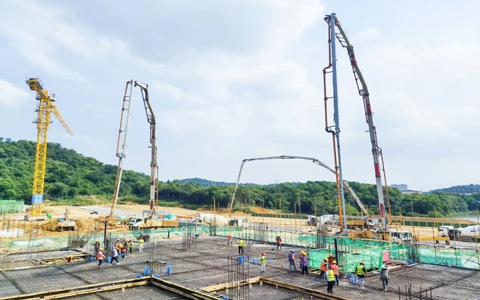 此次澆筑項目為長江軍事主題文化區(qū)-中山艦博物館關鍵部分,徐工以 “1+2+10+1” 成套化設備迎戰(zhàn):1臺HB72V、2 臺HB62V大米數(shù)泵車打頭陣,10臺12方新能源攪拌車、1臺XGT7026-12S1塔機組成 “補給梯隊”,展現(xiàn)“1+2+10+1 > 14”的成套化作業(yè)優(yōu)勢。