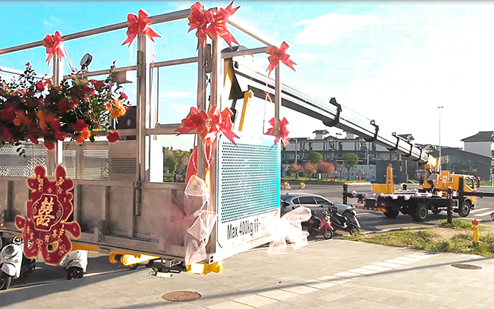 這輛 GKS45A 高空作業(yè)車剛完成交付,客戶便別出心裁地將其打造成婚車。車頭的 “囍” 字鮮艷奪目,車身纏繞的紅綢與花束將機(jī)械的硬朗感與婚禮的浪漫感巧妙融合。在喜慶的音樂(lè)與路人的祝福中,它行駛在婚車隊(duì)列之首,成為新人幸福旅程的 “硬核” 見(jiàn)證者。