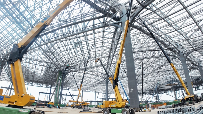 西安東站建設(shè)工地上,徐工高空作業(yè)平臺組成“鋼鐵軍團”正全速推進施工。10余臺30-40米直臂車伸展巨臂,精準對接站房屋頂鋼結(jié)構(gòu)焊接;12米剪叉車靈活穿梭,高效配合內(nèi)部砌墻作業(yè)。