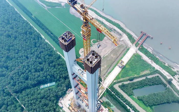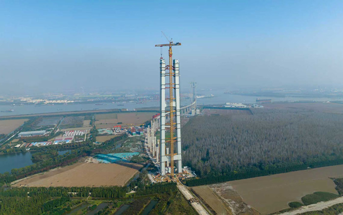 在靖江市馬洲島上空,重達(dá)238噸的T29鋼塔節(jié)段在徐工XGT15000-600S超級(jí)塔機(jī)的穩(wěn)定牽引下平穩(wěn)攀升,精準(zhǔn)完成高空對(duì)接,整個(gè)吊裝過程中,塔身始終穩(wěn)如磐石,為張靖皋長江大橋關(guān)鍵節(jié)點(diǎn)的突破提供了堅(jiān)實(shí)支撐。