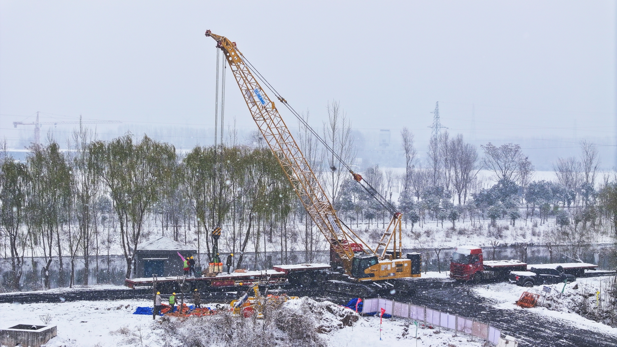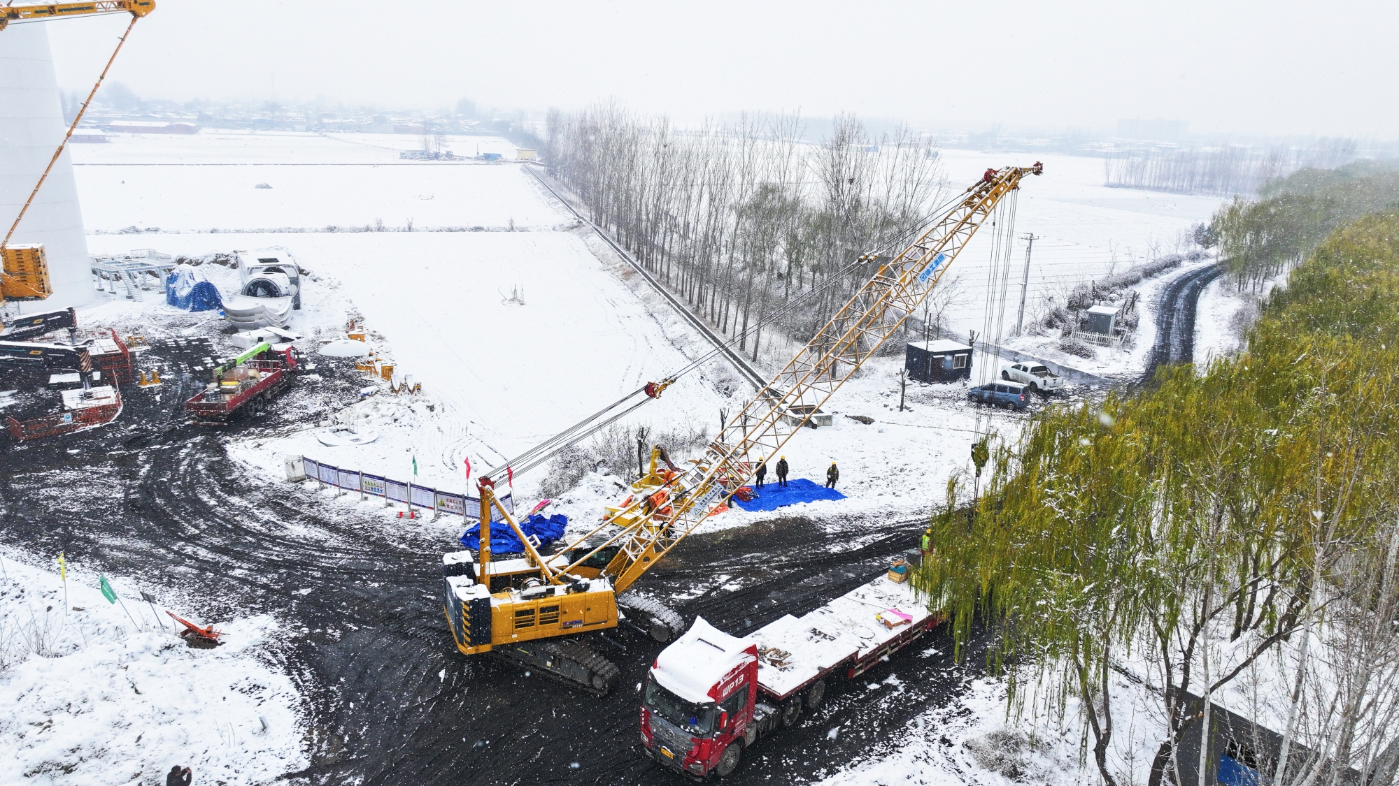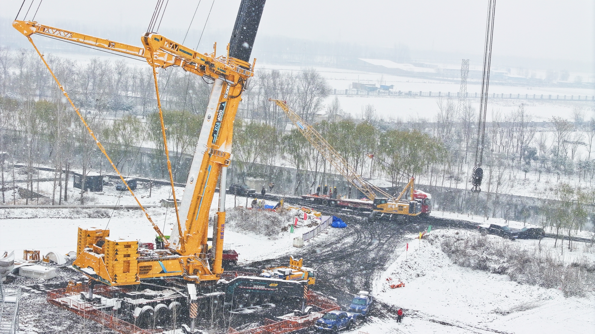 大雪紛飛,地面濕滑,吊裝作業(yè)面臨嚴峻考驗。XGC85投入作業(yè),高效配合“全球第一吊”XCA4000完成組裝任務。