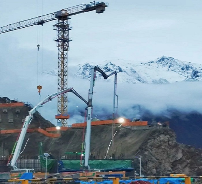 連續(xù)泵送14小時后,峽谷開始刮起側(cè)風(fēng),臂架末端出現(xiàn)輕微擺動。在第三代智能臂架技術(shù)加持下,臂架上下振幅<130mm,左右<100mm,保證平穩(wěn)澆筑。