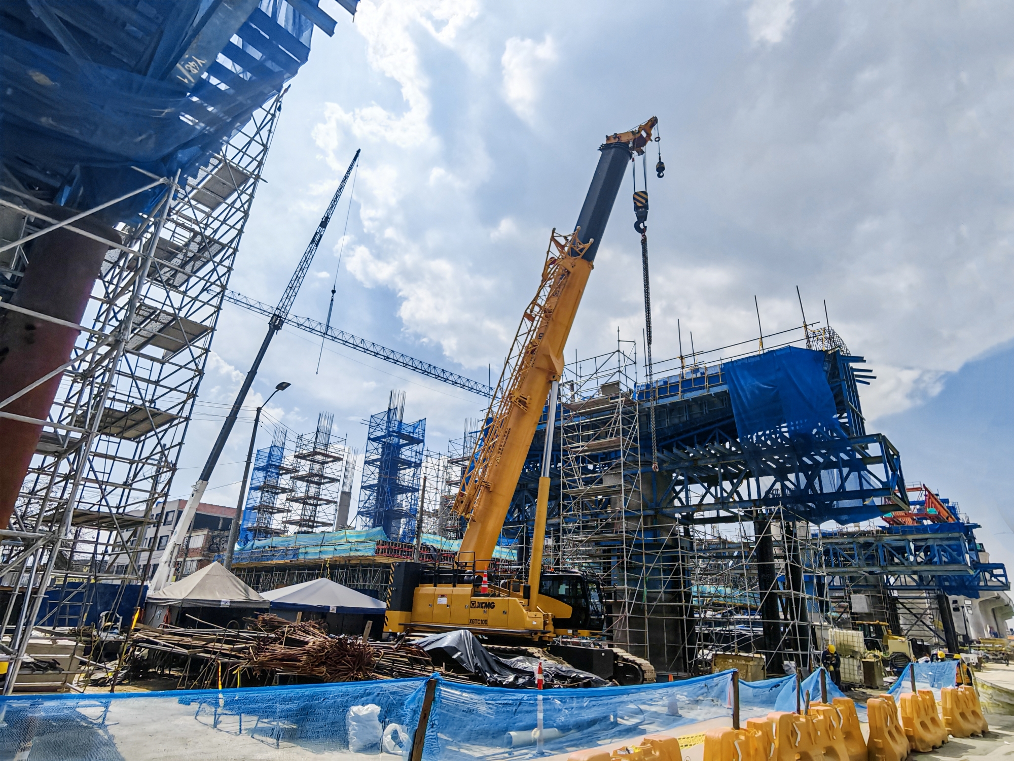 項(xiàng)目施工貫穿城市核心區(qū)域,需臨時(shí)占用公路,作業(yè)空間狹窄、交通密集,對(duì)設(shè)備靈活性要求極高。傳統(tǒng)起重機(jī)因占地面積大、帶載行駛性能差難以適配這一復(fù)雜工況,而XGTC80與XGTC100兩款設(shè)備憑借核心優(yōu)勢(shì)成功破局。
