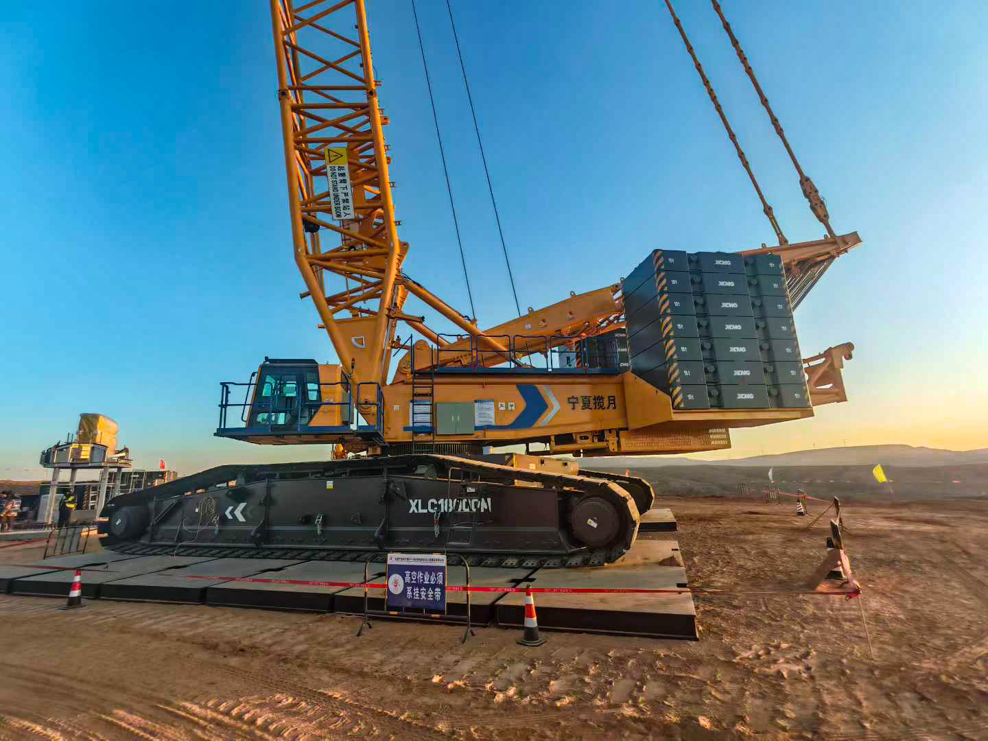 在這里,徐工XLC18000M(1300噸級)履帶起重機(jī)正在執(zhí)行125米高的風(fēng)電機(jī)組吊裝任務(wù)。