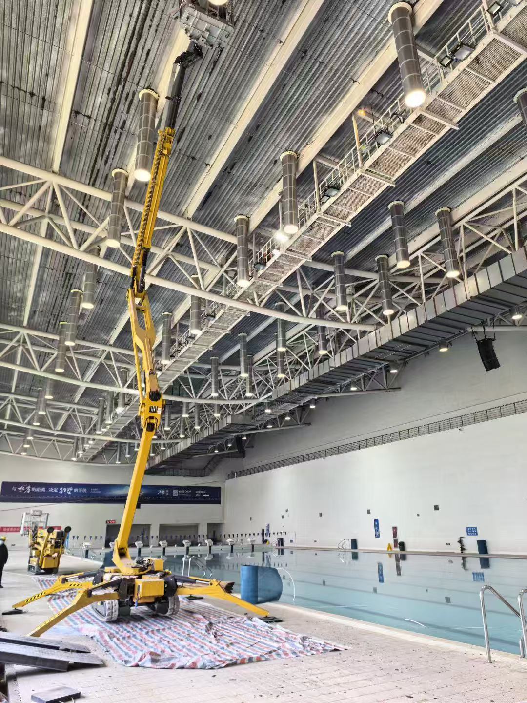 該設(shè)備采用履帶式底盤,自重4.6噸,接地比壓小,完美適配泳池低承重及地面保護作業(yè);車寬僅0.99m,可靈活穿梭狹窄通道,通行無阻;工作幅度可達15m,無需頻繁起降,省時高效,到場即可開工,此次施工僅配置3臺設(shè)備和10名操作人員,便能高效推進任務(wù),在保障工程質(zhì)量的同時顯著縮短了工期,實現(xiàn)了效率與成本的雙重優(yōu)化。