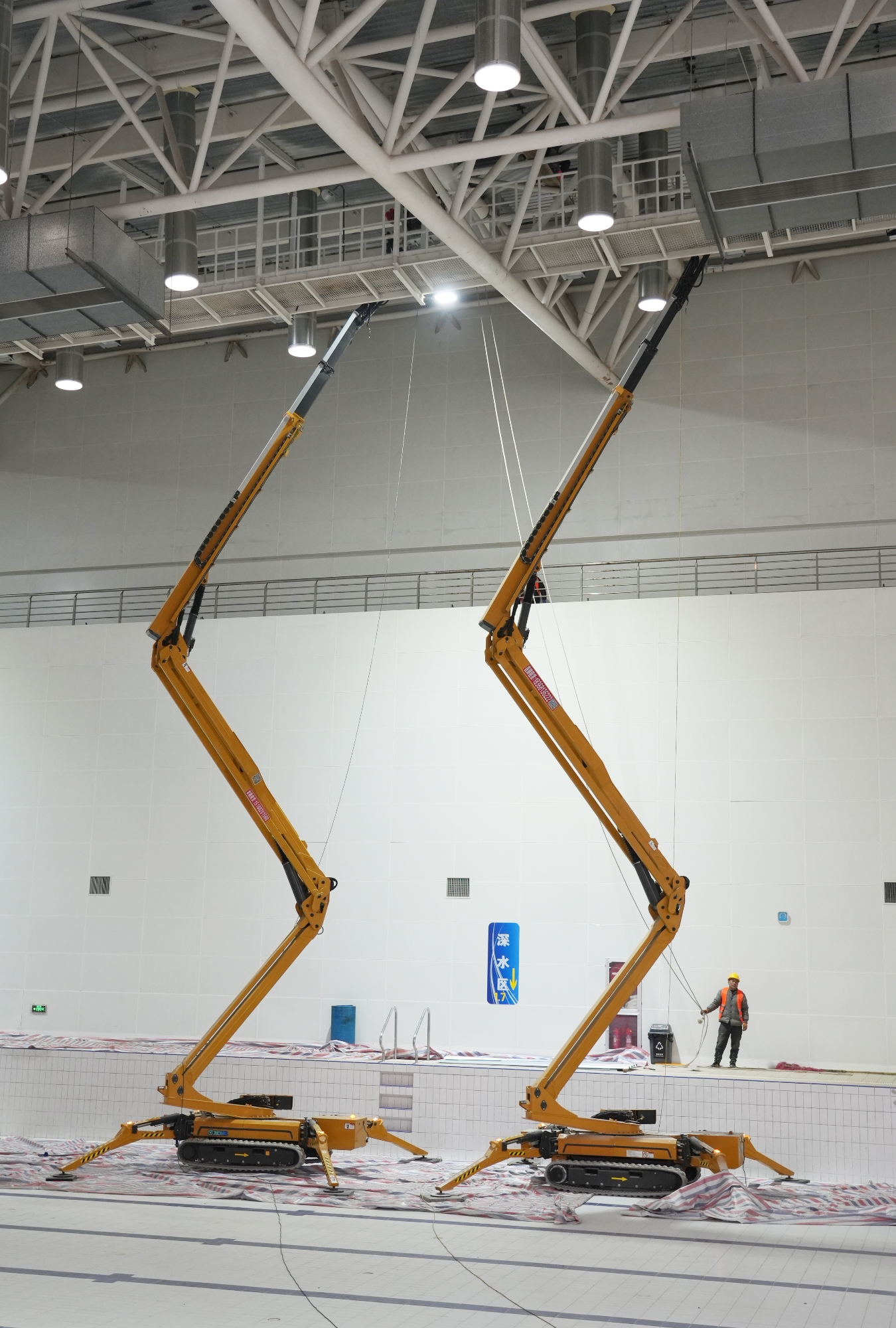 據(jù)悉,該項目策劃伊始,便遇到兩大難題:場地狹窄,入口寬1m高20m,且場館下方為地下車庫,地面承重低,普通臂車無法進場;若采用傳統(tǒng)腳手架,需滿架搭建,成本高且工期長。面對如此工況,徐工XGA26X-Li蜘蛛車精準破局,成為受限空間施工核心利器。