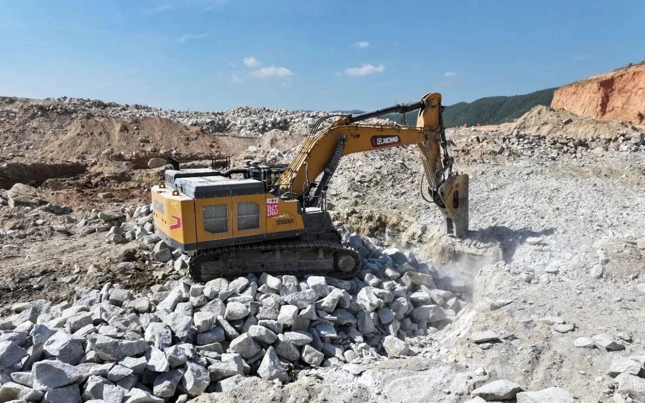 項目現(xiàn)場機械轟鳴、熱火朝天,四十余臺徐工挖掘機有序開展破碎與裝車作業(yè)。該工業(yè)園依山而建,土石方量達600萬方,現(xiàn)場多為質(zhì)地堅硬的麻石,施工難度極大。徐工20-70噸級挖掘機聯(lián)袂出擊,組建專屬施工矩陣??蛻籼寡?,前期使用其他品牌設備時破碎吃力,經(jīng)徐工工作人員推薦嘗試其大噸位挖掘機后,憑借出眾表現(xiàn)逐步完成全面置換,成功攻克施工難題。