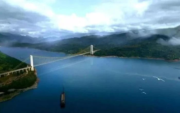 萬(wàn)州新田長(zhǎng)江大橋是三峽庫(kù)區(qū)在建跨度最大的雙塔單跨鋼箱梁懸索橋,大橋全長(zhǎng)1.7公里,一跨過(guò)江,主跨1020米,是三峽庫(kù)區(qū)繼萬(wàn)利高速駙馬長(zhǎng)江大橋之后的又一座千米級(jí)懸索橋。