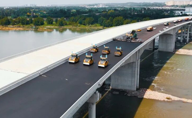 此次施工路段是典型的“橋梁密集型”路段,橋梁工程占比高達(dá)95.5%,且橋面鋪裝寬度頻繁切換,從24.5米寬幅主線到19.4米窄幅匝道,過渡段線形銜接與高程控制需達(dá)到毫米級精度。針對窄幅匝道空間受限、橫坡多變的特點(diǎn),采用伸縮攤鋪機(jī)與“分段精準(zhǔn)壓實(shí)”傳統(tǒng)工藝組合模式,克服空間作業(yè)限制;針對寬幅與窄幅過渡段,優(yōu)化攤鋪搭接工藝設(shè)置漸變過渡帶,精準(zhǔn)控制銜接處高程與平整度偏差,確保壓實(shí)質(zhì)量達(dá)標(biāo)。最終實(shí)現(xiàn)平整度<0.5、壓實(shí)度≥99.8%,全面高質(zhì)達(dá)標(biāo)。