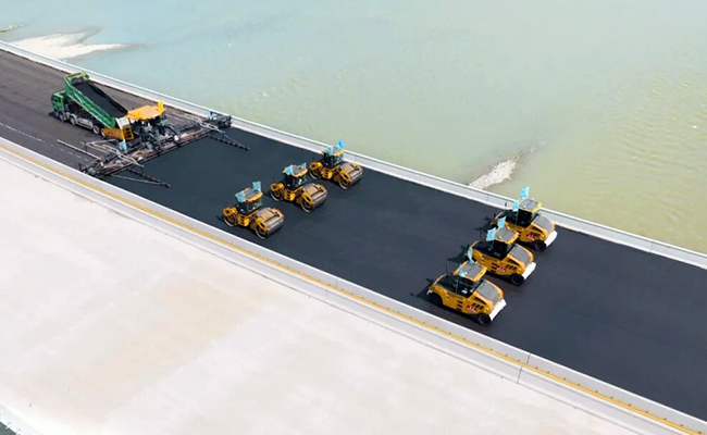 項目協(xié)調(diào)難度大,且易延誤工期,徐工針對性部署智慧施工集群,采用“大寬度攤鋪+北斗無人碾壓”方式,超寬幅攤鋪機(jī)一次攤鋪成型,數(shù)字化智能施工系統(tǒng)通過預(yù)設(shè)參數(shù),實(shí)現(xiàn)碾壓軌跡、遍數(shù)與溫度的精準(zhǔn)控制,從而顯著提升施工效率,快速推進(jìn)寬幅段落施工。