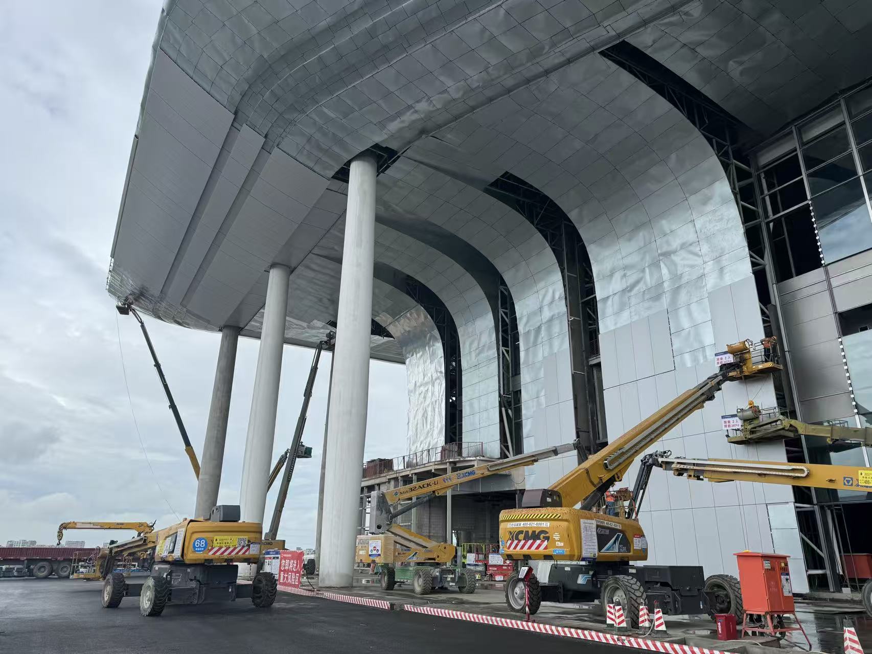 而在站房外圍,立面幕墻施工正面臨另一重考驗(yàn)。異形鋁板的高精度安裝,要求設(shè)備必須具備大范圍覆蓋與穩(wěn)定的高空輸送能力。徐工大米級(jí)直臂車(chē)以超強(qiáng)的舉升能力和長(zhǎng)臂架延展性,成為幕墻安裝的“主力軍”。即使在高空強(qiáng)風(fēng)環(huán)境下,智能臂架控制系統(tǒng)依然能保證作業(yè)平臺(tái)穩(wěn)固,讓工人能從容完成定位、校準(zhǔn)與固定。其高效的轉(zhuǎn)場(chǎng)能力,更使得設(shè)備在長(zhǎng)達(dá)數(shù)百米的作業(yè)面上快速調(diào)配,大幅縮短了工期。