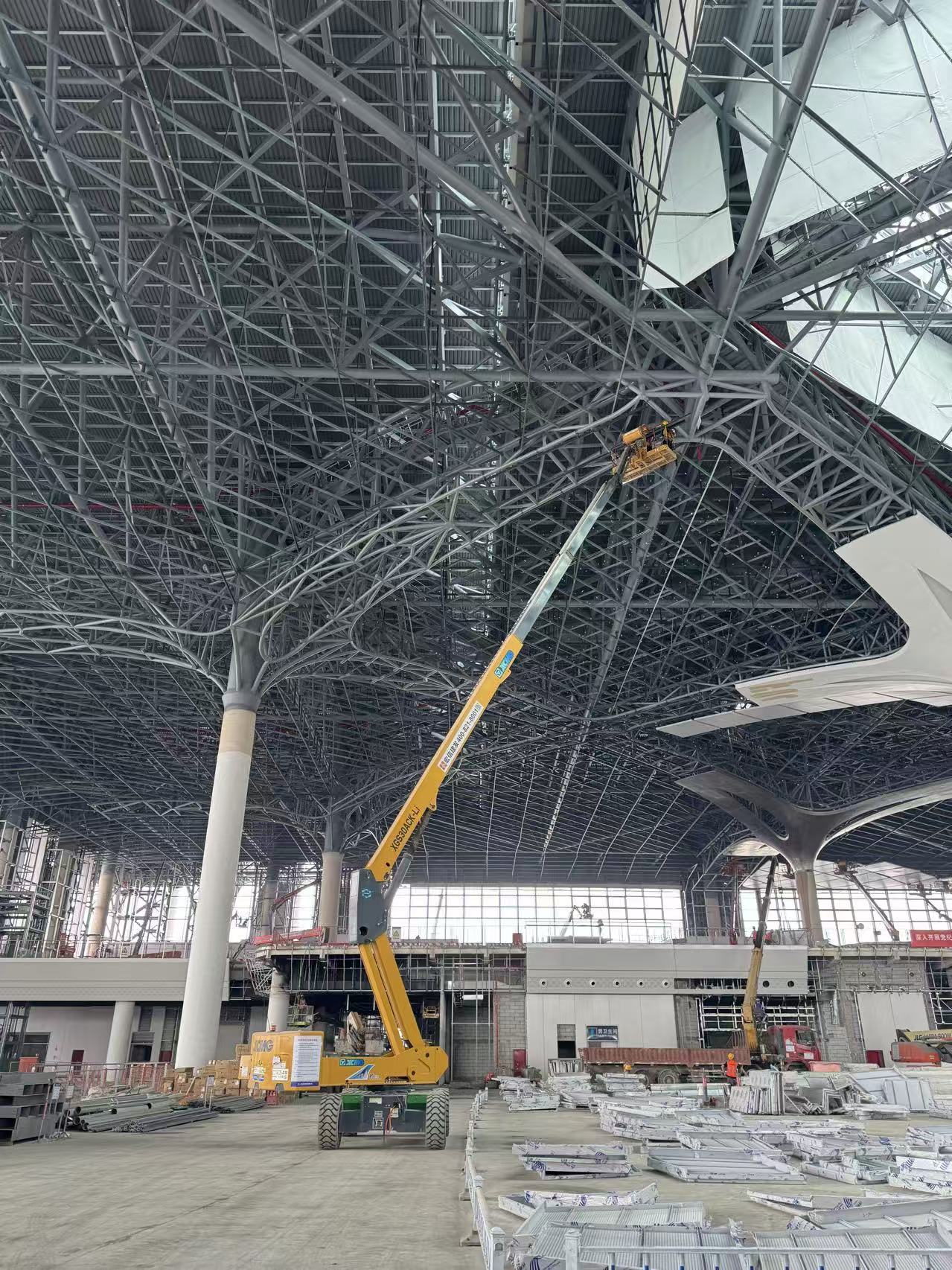 步入站房?jī)?nèi)部,抬頭仰望,巨大的穹頂鋼結(jié)構(gòu)如編織的“榕樹(shù)”根系交錯(cuò)延伸,施工難度極高。面對(duì)最高處近30米的作業(yè)高度,徐工30米級(jí)電動(dòng)直臂車(chē)展現(xiàn)了其“進(jìn)得去、站得穩(wěn)、伸得準(zhǔn)”的硬核實(shí)力。設(shè)備采用緊湊設(shè)計(jì)與精準(zhǔn)操控系統(tǒng),在站內(nèi)狹長(zhǎng)的通道和密集的臨時(shí)支撐架間靈活穿行,憑借平穩(wěn)的臂架伸縮與微動(dòng)性能,施工人員得以在籃筐內(nèi)如履平地,精準(zhǔn)完成高空焊接、螺栓緊固及防火涂料噴涂。