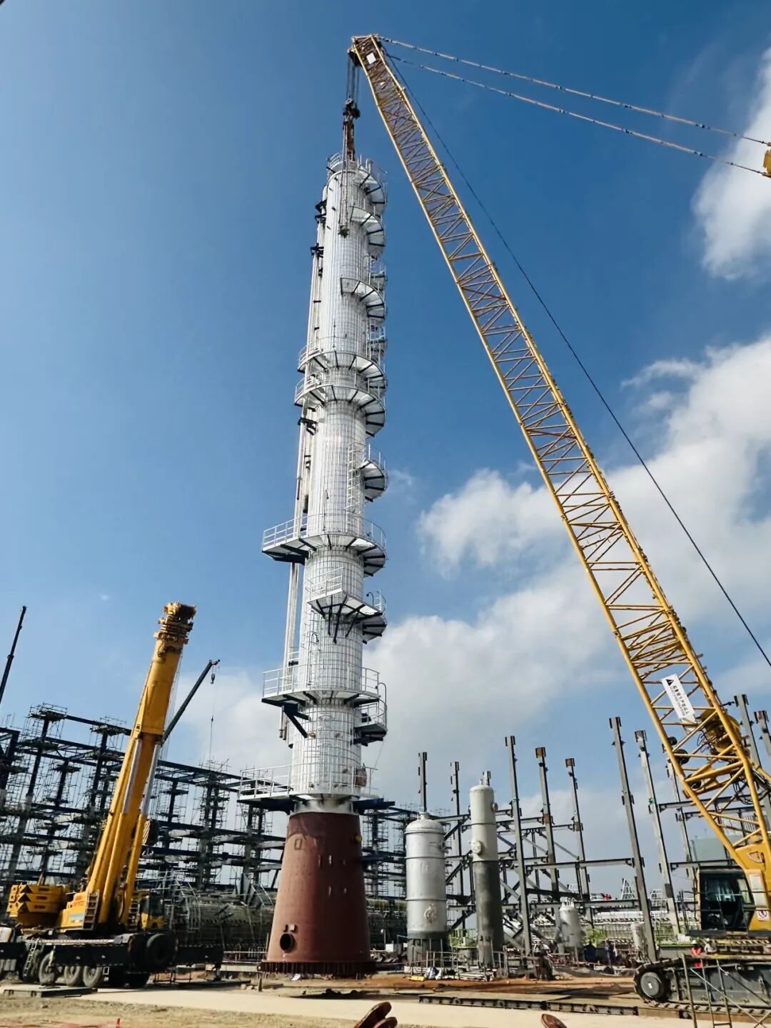 挑戰(zhàn)突破:擎起石化“巨無(wú)霸”此次吊裝的C-201苯塔為裝置最高核心重器,體型龐大、安裝精度要求極高。面對(duì)場(chǎng)地限制、設(shè)備高聳易受風(fēng)載影響等難題,徐工XGC400以超凡性能迎難而上:
