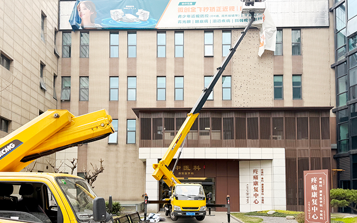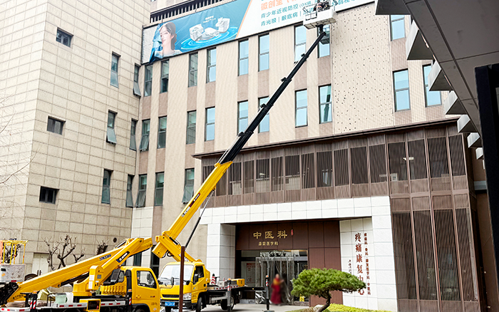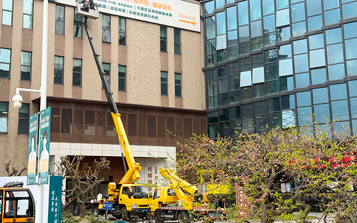 廣告牌坐落于醫(yī)院門診樓高層,作業(yè)高度超出常規(guī)設(shè)備作業(yè)范圍;建筑入口空間緊湊,周邊人流密集,既要避免干擾醫(yī)院正常診療秩序,又要保障設(shè)備靈活轉(zhuǎn)向與精準(zhǔn)定位;同時,緊鄰門診區(qū)域的作業(yè)環(huán)境對施工安全與穩(wěn)定性提出了較高要求,需全程保持設(shè)備平穩(wěn)運行。